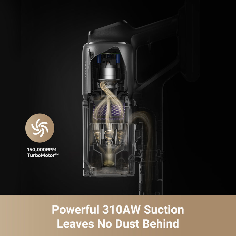 - *310AW, 150,000RPM: Based on our in-house lab data, actual performance may vary. The 310AW suction power, which represents the highest value within the Dreame cordless stick vacuum product line as of May 2024.