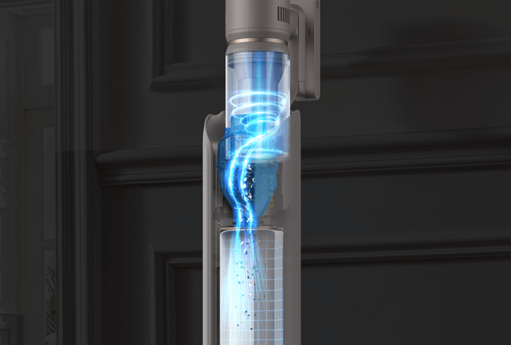The Dust-Removal Hub uses a filtration mechanism that effectively filters particles from the dust cup.